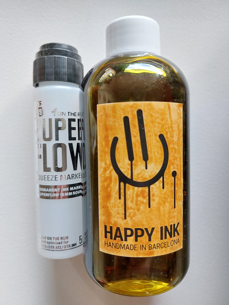 This squeezer with a 18 mm nylon tip is filled with the Rust ink from Happy Ink. These tips are quite good for metal and glassetch!